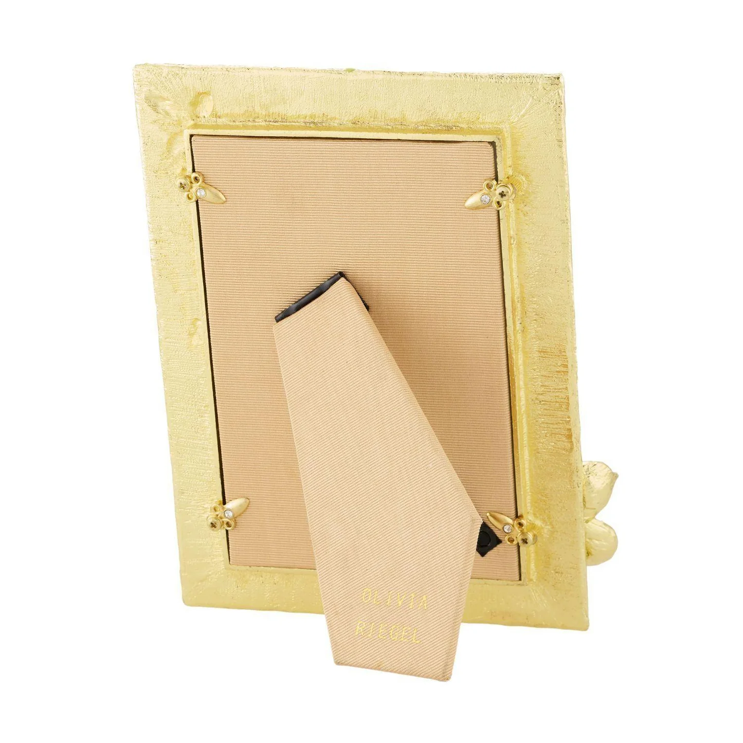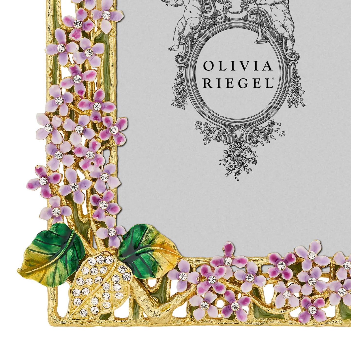 Majestic floral patterned picture frame, inspired by the opulence of lilac blossoms. Gold finished pewter, with intricate hand-enameling in purple, dark green, gold, and celadon hues. Embellished with hand-set clear European crystals. Elegant champagne moiré silk back, with easel designed for vertical or horizontal placement. Tarnish resistant. Signature luxury gift box included.