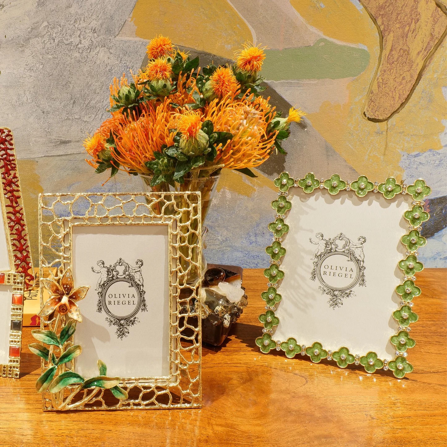 Add the elegant Green Gold Celadon Enamel Clover Frame from Olivia Riegel in 5″ X 7″ size to your home decor.