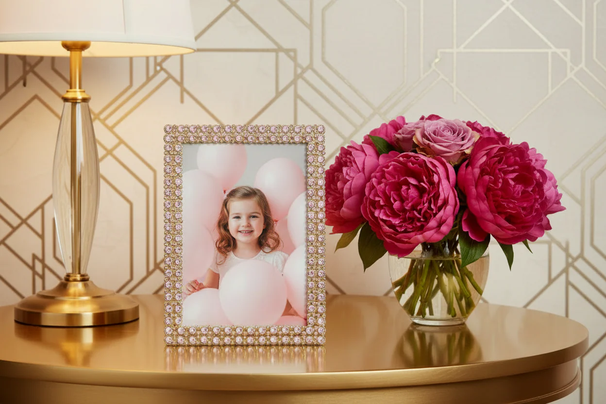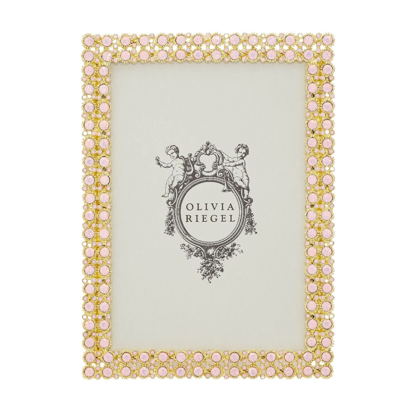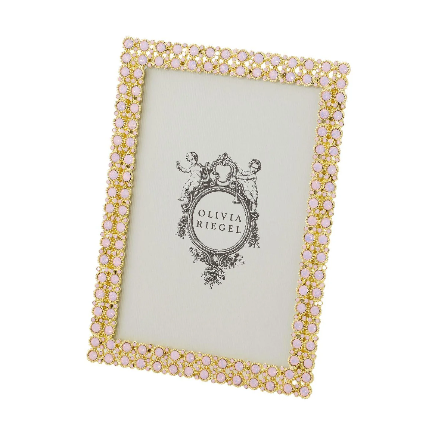 Gold finished pewter, encrusted with hand-set pink opaline European crystals. Beveled glass. Elegant champagne moiré silk back, with easel designed for vertical or horizontal placement. Tarnish resistant. Signature luxury gift box included.
